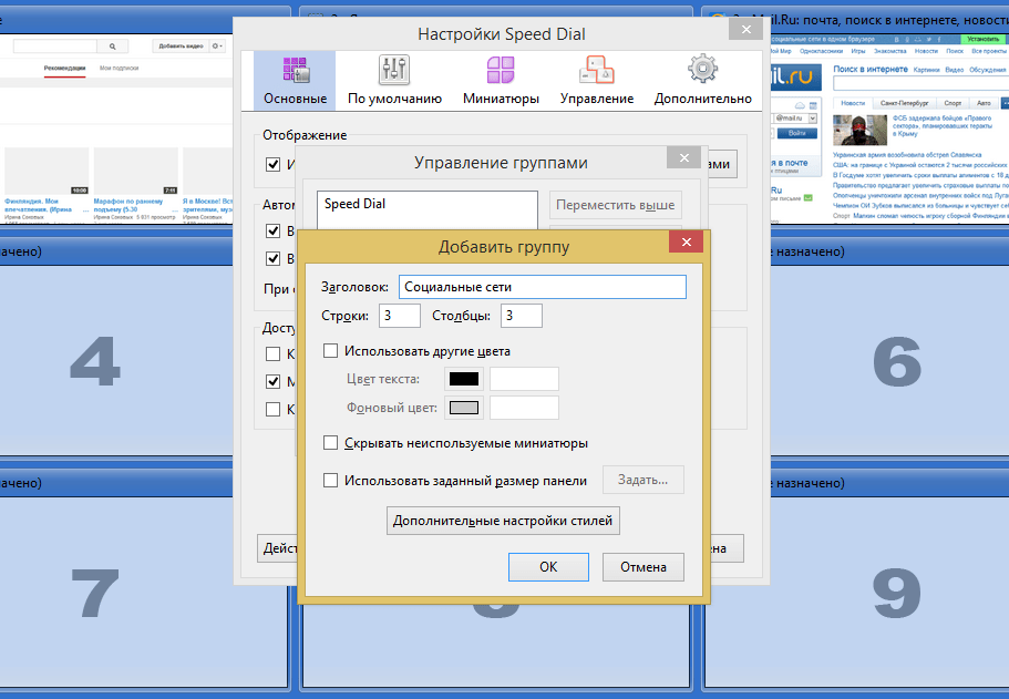 В настройках отображения вы можете менять количество «Окон в ряду» (максимальное число — 17) и «Минимальное число строк» (максимальное число — 10). Можно выбрать количество окон только по горизонтали, при добавлении новых закладок, их количество будет увеличиваться автоматически.