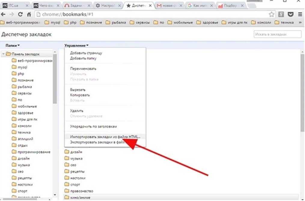 1. В диспетчере закладок браузера следует кликнуть «Управление» -> «Импортировать закладки из файла HTML».