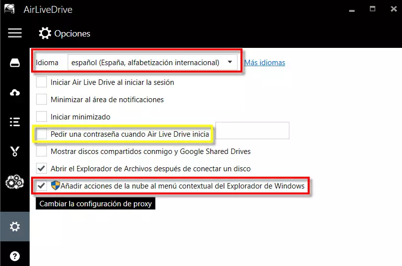 Here in the Air Live Drive options we have the possibility to choose the language, that the program loads when logging in and ask for a password when it starts up, but for that you have to have the Pro version. Then, an interesting option to activate is to add cloud actions to the context menu of Windows Explorer.