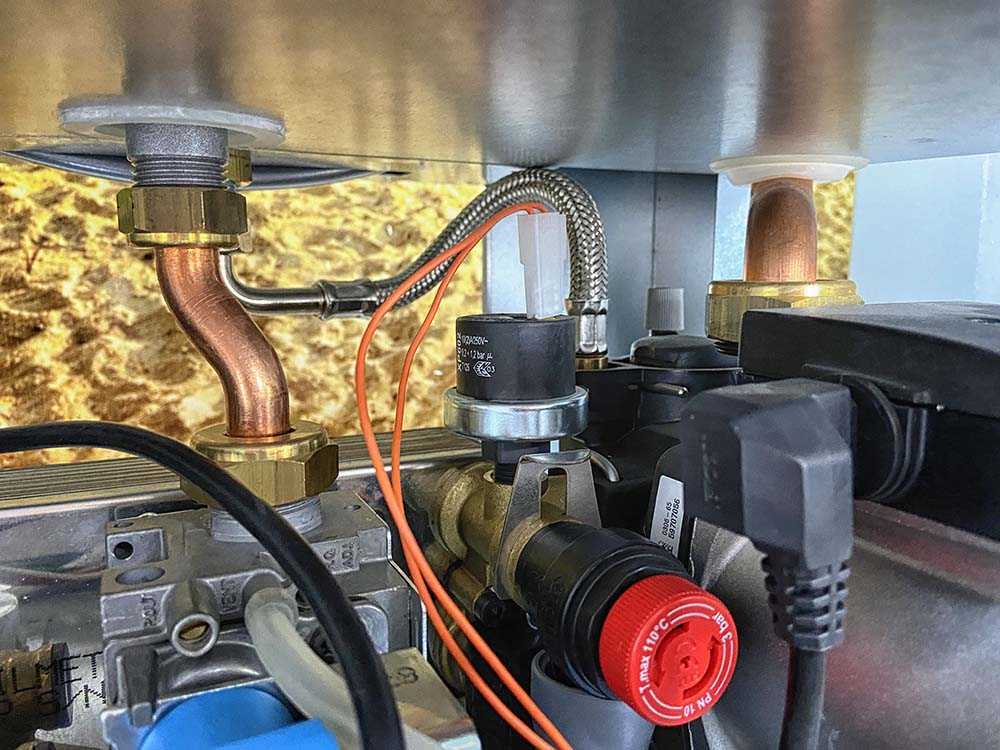Датчик давления воды установлен с левой стороны гидравлической группы. Для его проверки необходимо отсоединить разъем датчика. Далее мультиметр необходимо установить в режим проверки электрической цепи и проверить контакты реле. Мультиметр показывает, что реле не замкнуто, при том, что в котле давление воды в системе отопления в зеленой зоне. Значит, датчик является неисправным и необходима его замена. Покупать датчики рекомендуется в специализированных магазинах, либо у официальных производителей котла, для избегания покупки контрафакта.