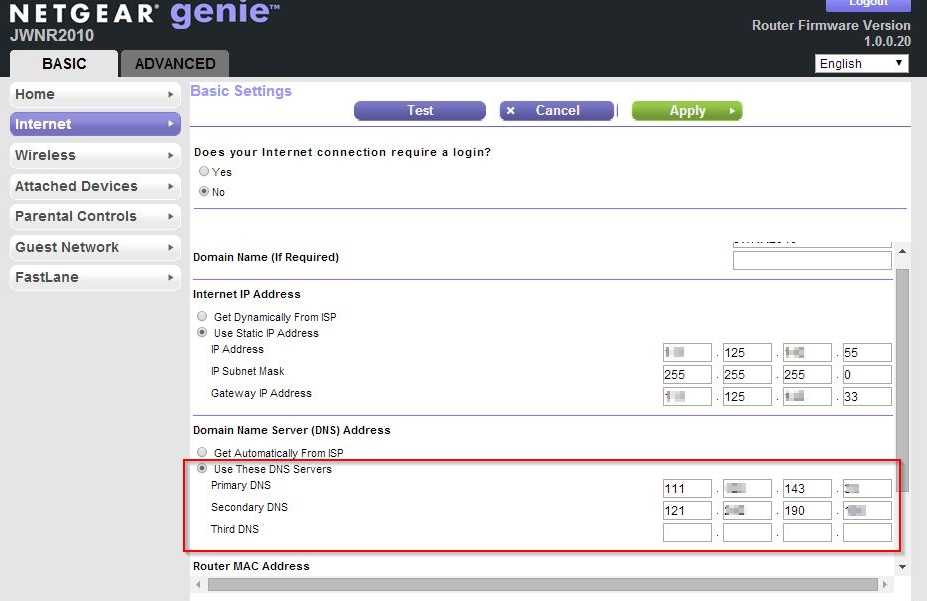 - Scroll down to the fields DNS1 and DNS2. If these fields have the values in them, note them down in case you want to return to your original settings.