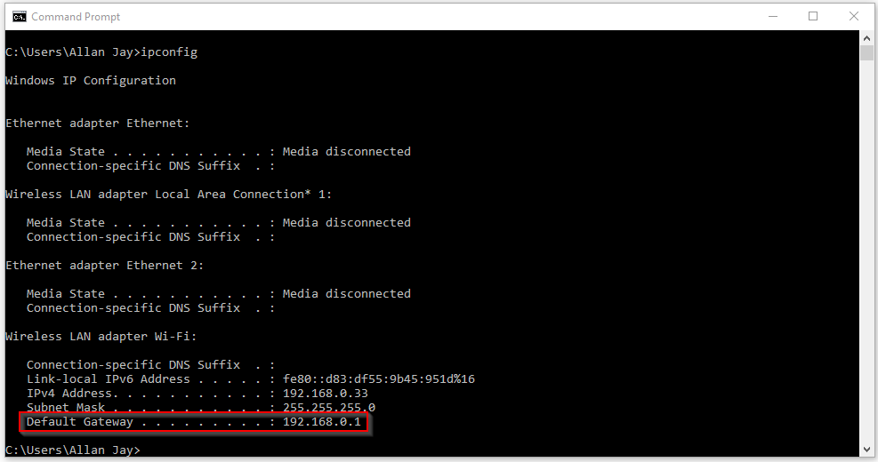 To access the router’s interface, make sure that you are connected to the router’s network. Open a browser and enter your router’s IP address. Typically, most routers use 192.168.0.1 or 192.168.0.2. To make sure that you have the right IP addrbess, launch the command prompt and enter ipconfig. The IP address on the Default Gateway is the router’s IP address.