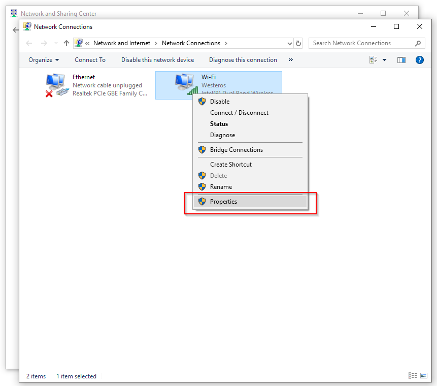 - Right-click on the network you use to connect to the internet and select Properties from the context menu.