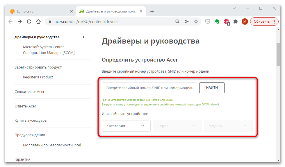 - В поле поиска ввести модель своего ноутбука Acer, серийный номер, или SNID. Эту информацию можно посмотреть снизу ноутбука, на наклейке.