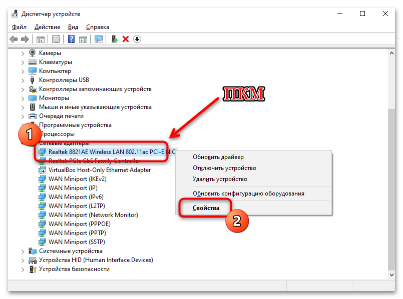 В первом случае необходимо открыть упомянутое системное приложение. Если в разделе «Сетевые адаптеры» около устройства беспроводной сети отображается значок в виде восклицательного знака, то ПО для оборудования требует обновления. Щелкните правой кнопкой мыши по его названию и выберите пункт «Обновить драйвер».