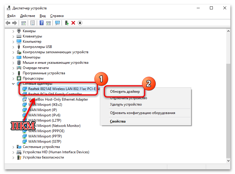 - Снова выберите целевой адаптер, кликните по нему (делать это необходимо правой кнопкой мыши) и выберите опцию «Обновить драйверы».