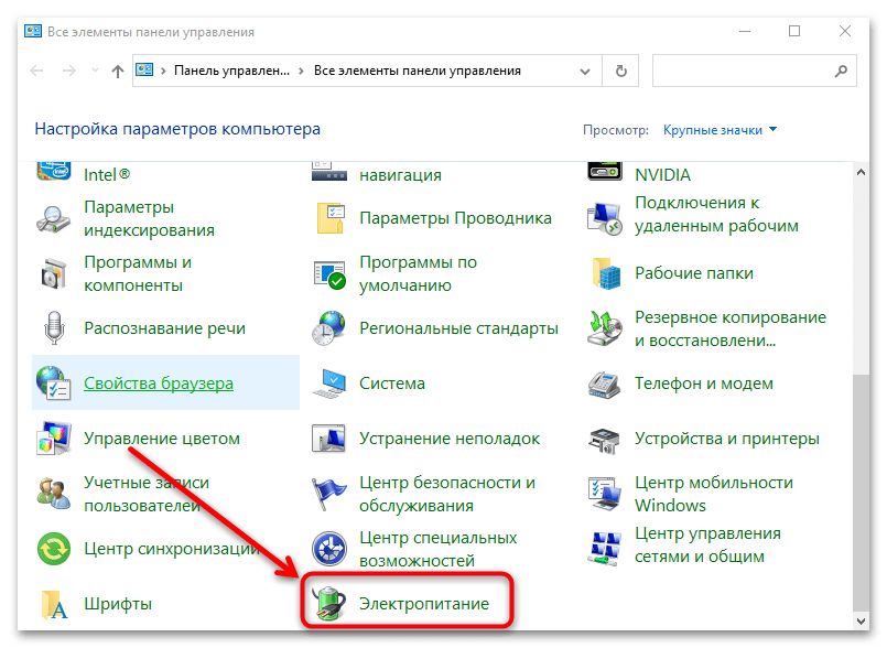 - Перейти в «Панель управления», затем выбрать раздел «Электропитание».