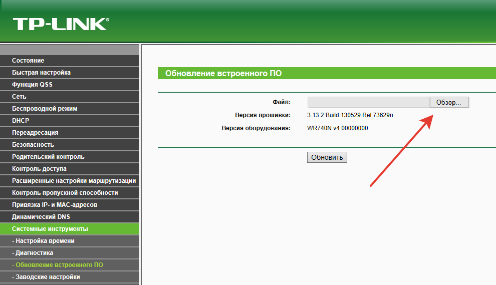 На следующем шаге, необходимо в поле «Файл» кликнуть по кнопке «Обзор». Затем следует указать папку, в которой находится прошивка для tp link tl wr740n