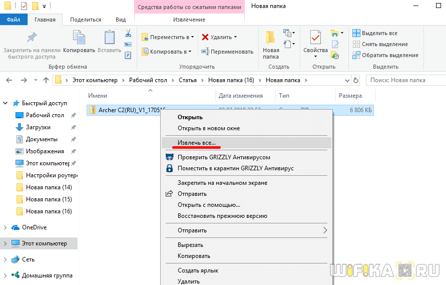 Скачанный файл будет из себя представлять ZIP архив — его нужно распаковать, чтобы выудить из него файл прошивки TP-Link. Для этого кликаем по нему правой кнопкой мыши и выбираем «Извлечь все»