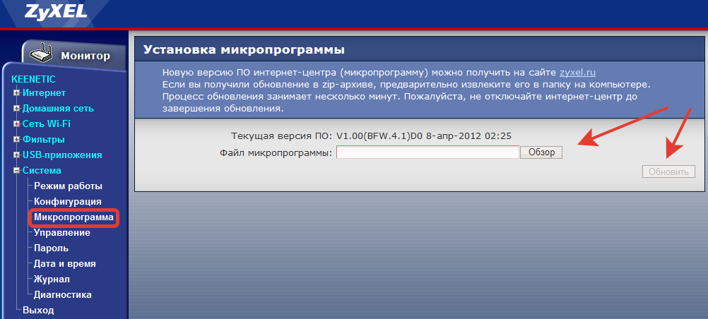 В системе выбираем пункт «Микропрограмма». Там отображается версия прошивки. Загружаем файл микропрограммы (скачанную прошивку) и обновляем ее.