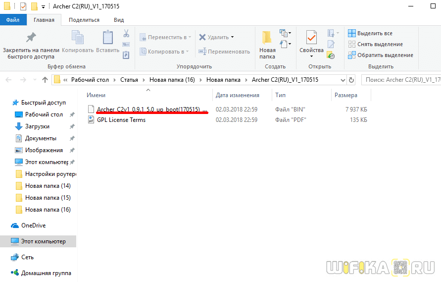 Откроется новая папка, где будет лежать файл прошивки для роутера TP-Link — у него будет название что-то типа «Archer_C2v1_0.9.1_5.0_up_boot(170515)_2017-05-15_11.06.07», в зависимости от модели.