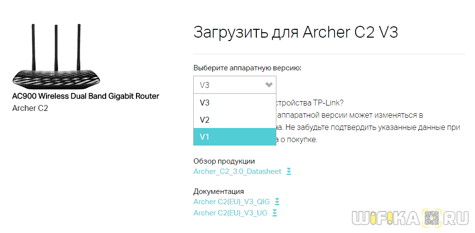 На страничке загрузок для данной модели TP-Link выбираем в выпадающем списке аппаратную версию — мне нужна V1.