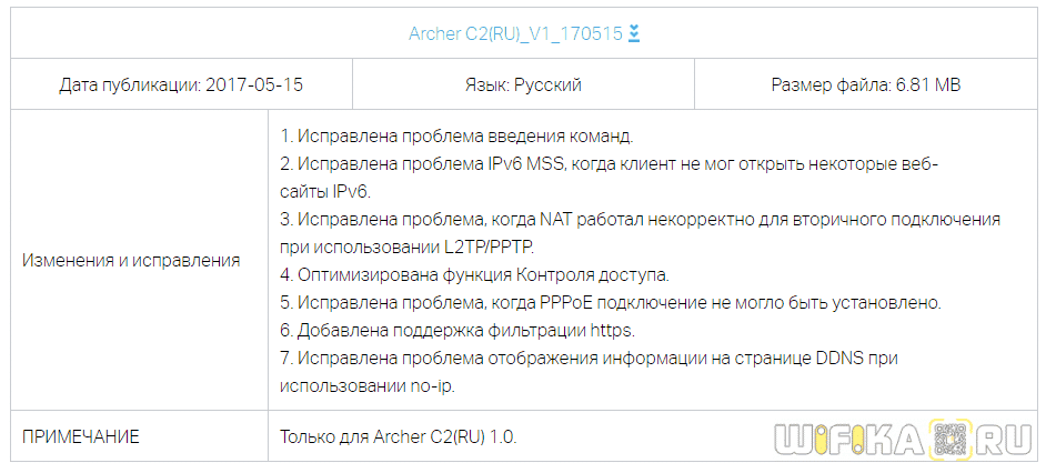 Тут мы видим несколько таблиц с описаниями последних обновлений — ищем самое свежее по дате (оно находится выше остальных). В описании видим, сколько различных исправлений было внесено в данную версию прошивки роутера TP-Link — еще один голос за то, чтобы делать обновление регулярно, чтобы поддерживать свой маршрутизатор в оптимальном состоянии.