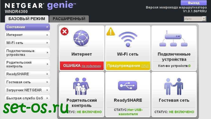 Когда логин и павроль успешно введены, откроется главная страница конфигуратора, на которой можно будет увидеть характеристики роутера и беспроводной сети. Изменяемых данных на главной странице нет, они представлены для ознакомления и при необходимости сравнения с заявленными провайдером показаниями.