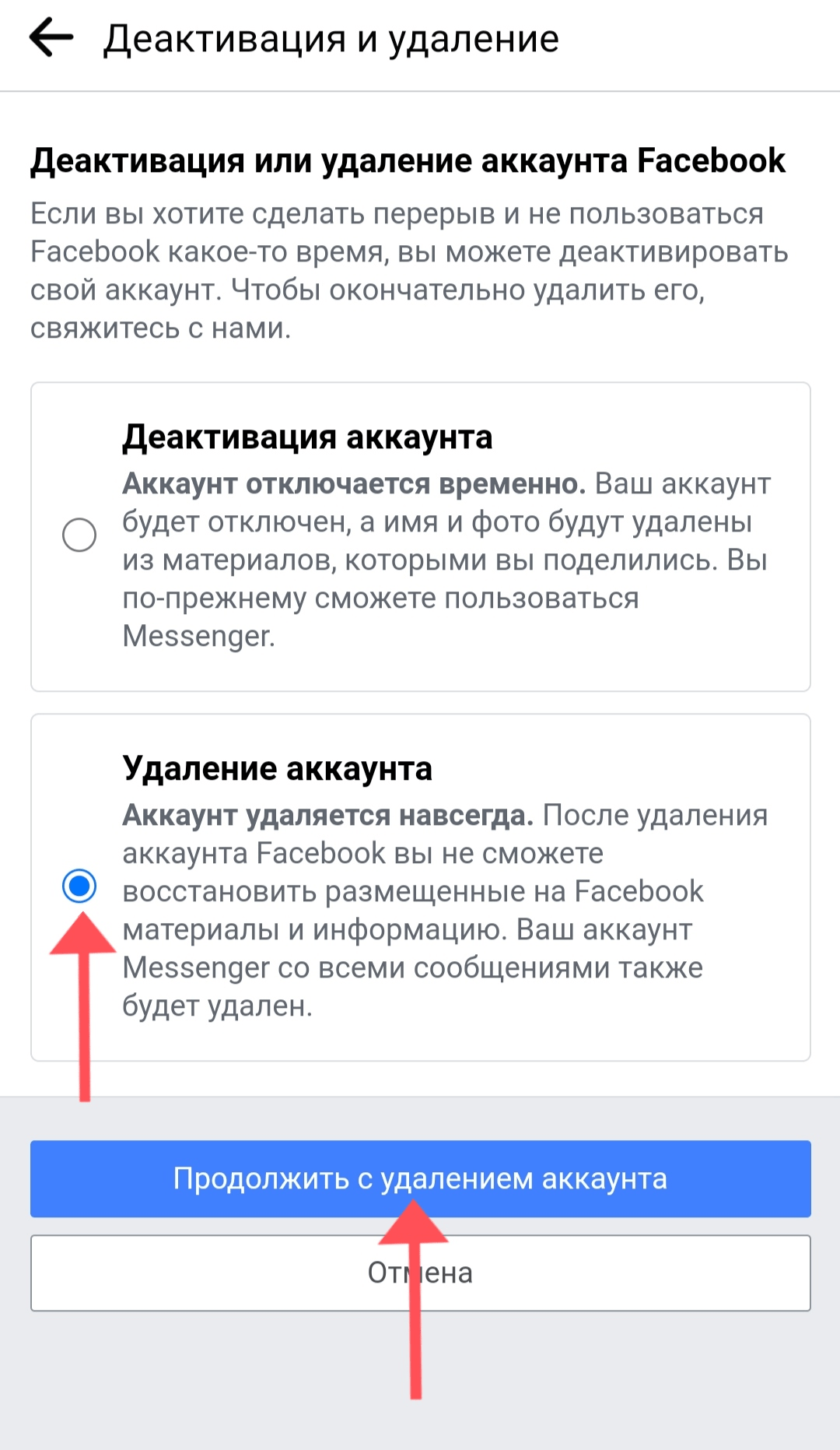 - Выбрав «удаление», избавьтесь от аккаунта навсегда;