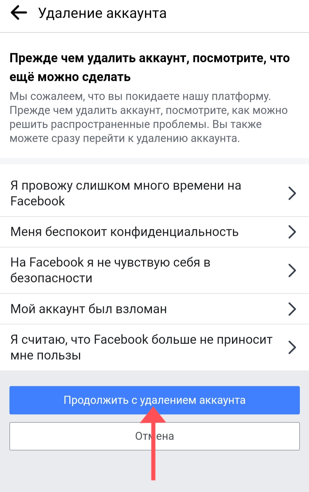 Далее выбирайте любую причину — это не влияет на дальнейшие действия. После чего в любом случае нужно кликнуть на «Продолжить с удалением аккаунта».