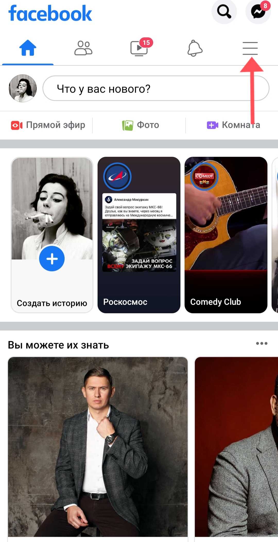 Необходимо войти на сайт с помощью мобильного приложения Facebook, авторизоваться и нажать на кнопку с изображением трех горизонтальных линий — она расположена в верхнем правом углу.