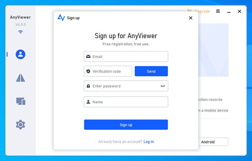 Step 1. Install and launch AnyViewer on both computers. Go to Log in, and then click Sign up. (If you already have signed up on its official website, you can log in directly.)