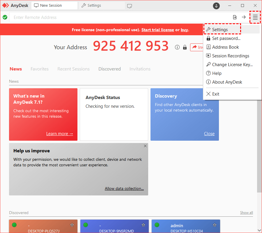 Step 1. Open AnyDesk and click the three horizontal lines in the top right corner. Select «Settings».