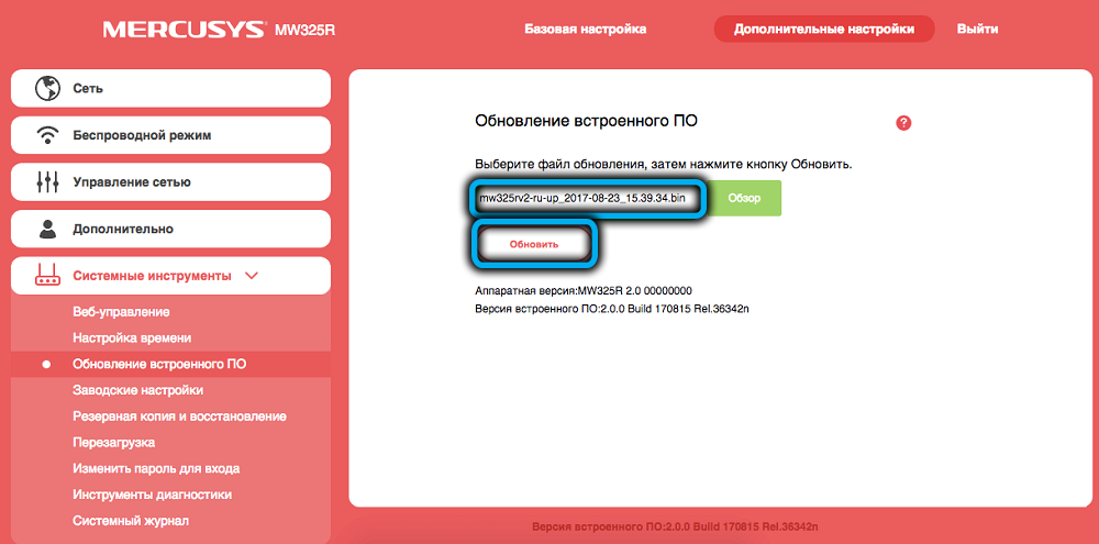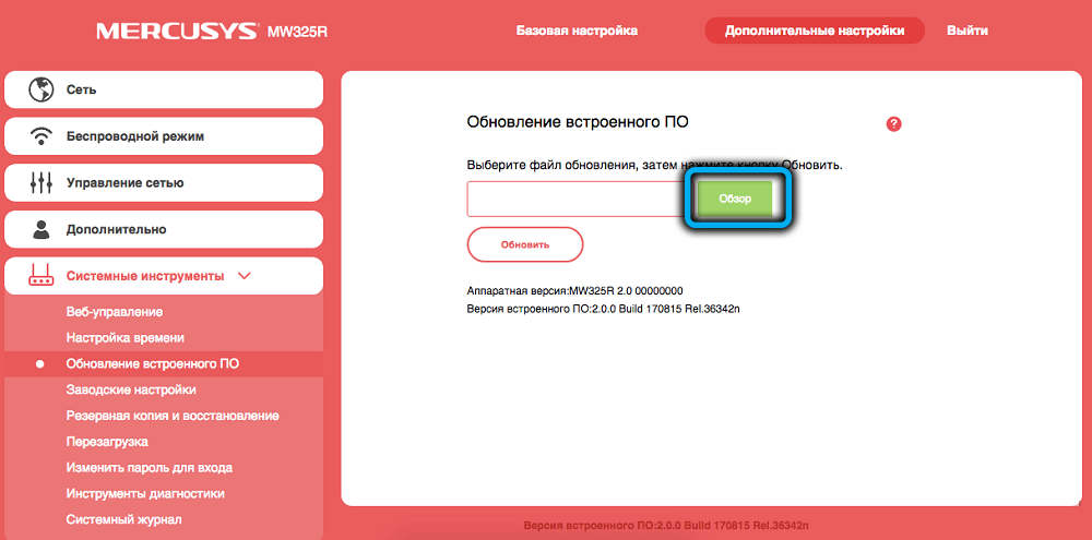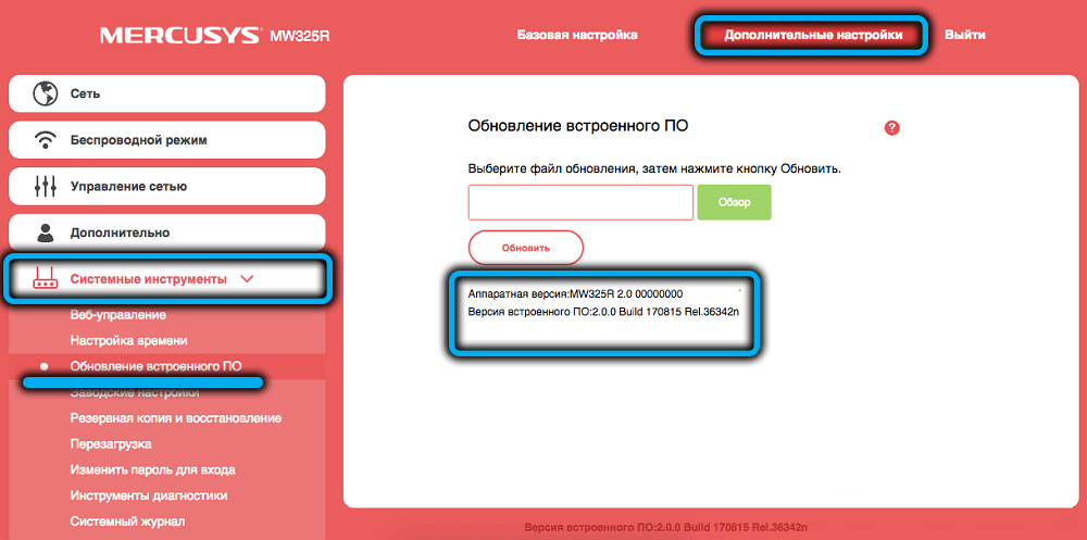 Нужно через браузер зайти в панель администрирования, набрав в адресной строке цифровой (192.168.1.1) или буквенный (mwlogin.net) адрес и введя установленные ранее идентификационные данные. Затем кликаем по вкладке «Расширенные настройки», выбираем в левой панели пункт меню «Системные инструменты» и подпункт «Обновление встроенного ПО».