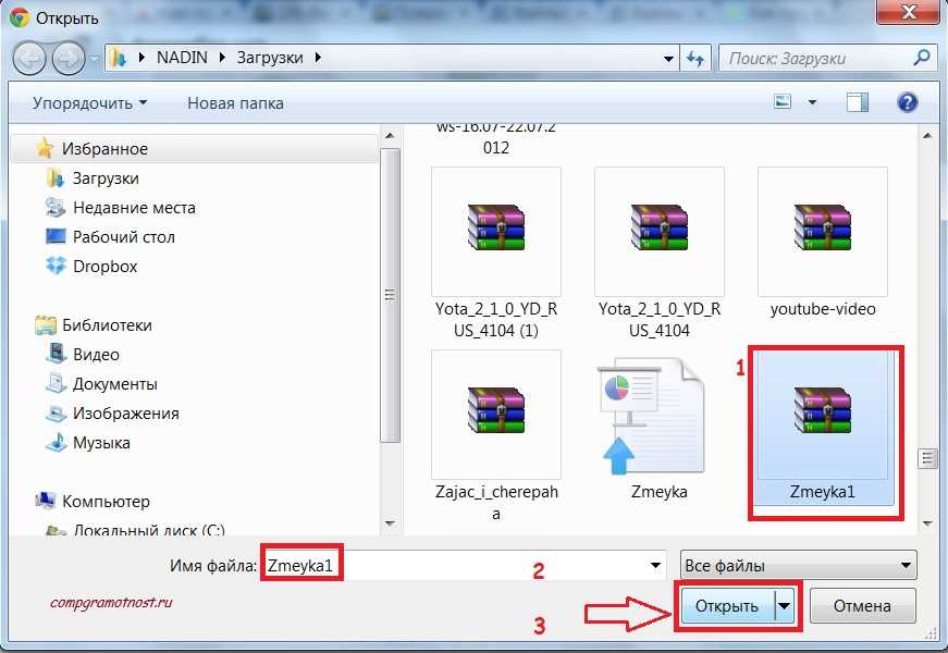 Находим свой файл, кликаем по значку файла (цифра 1 на рис. 4), после чего имя файла автоматически появляется в строке «Имя файла» (цифра 2 на рис. 4). Щелкаем по кнопке «Открыть» выбранный файл и сразу идет загрузка файла с Вашего компьютера на сервис DropMeFiles.