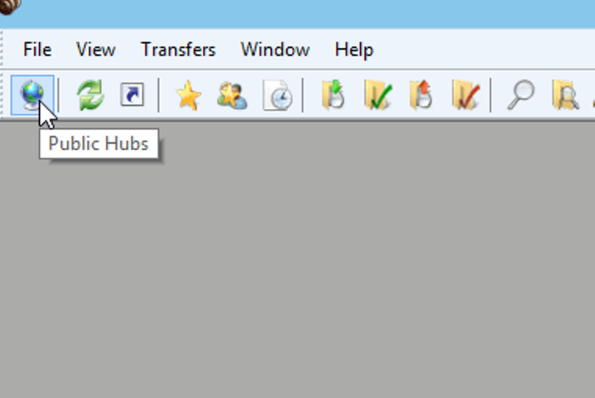 4) Теперь на нужно соединится с одной из тысячи сетей p2p. Самый быстрый — это нажать на кнопку «Public Hubs» в меню программы (см. скриншот ниже).