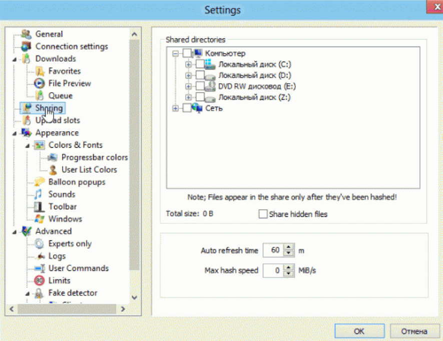 рис. 7 – Окно настроек в StrongDC