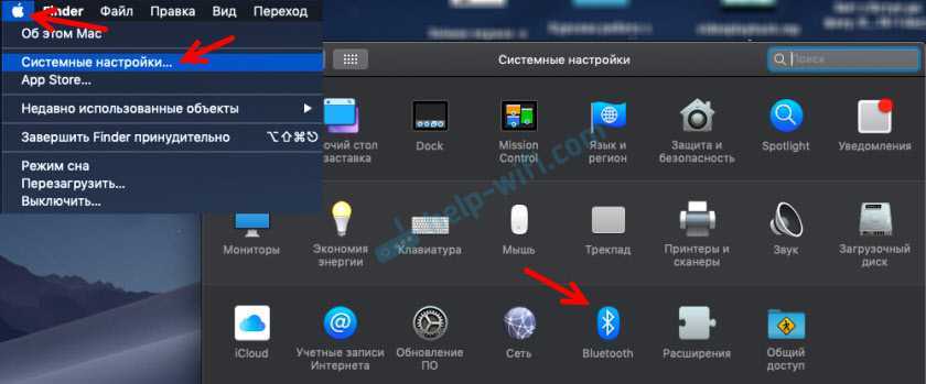 - Нажимаем по значку яблока и далее переходим в «Системные настройки», после этого открываем меню «Голубого зуба».