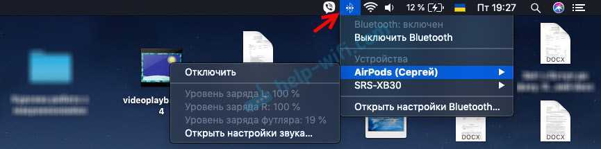 Если у вас иконка Bluetooth отображается в строке меню, то там тоже можно посмотреть уровень заряда каждого наушника AirPods и футляра.