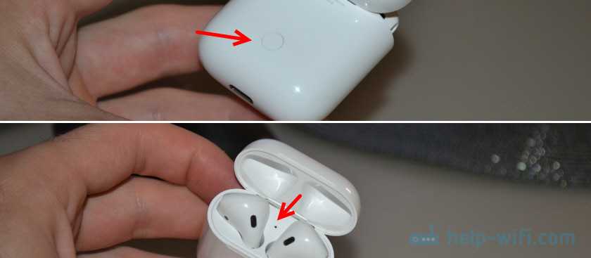 Ставим оба наушника в кейс и открываем его. Нажимаем кнопку на кейсе и держим ее секунды три. Индикатор начнет мигать белым цветом.