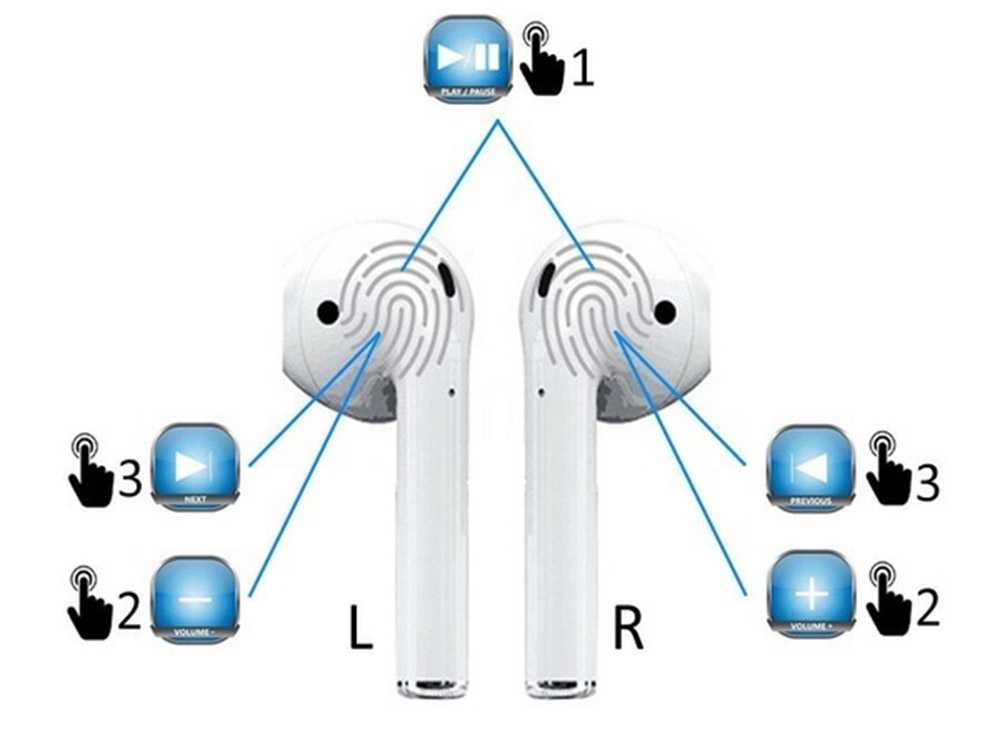 Управлять наушниками TWS i12 достаточно просто. Вам даже не понадобится инструкция на русском, чтобы во всём разобраться самому. Манипулировать проигрыванием можно кнопкой на любом вкладыше. Они также позволяют регулировать уровень громкости музыки. Для этого нужно нажать на панель 2 раза. При этом звук станет тише, если вы будете нажимать кнопку на левом. Если то же сделать на правом, звук станет громче.