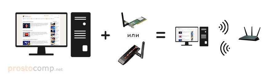 Поверьте, все проще чем кажется Вот у нас ПК без возможности подключения к беспроводным сетям. Мы покупаем адаптер, подключаем его в USB порт, или PCI слот компьютера и у нас уже компьютер с Wi-Fi. Можно подключать его к маршрутизатору без проводов. А если вы раздаете интернет с телефона, то сможете подключить свой компьютер к Wi-Fi сети телефона. Сделал небольшую картинку для наглядности.