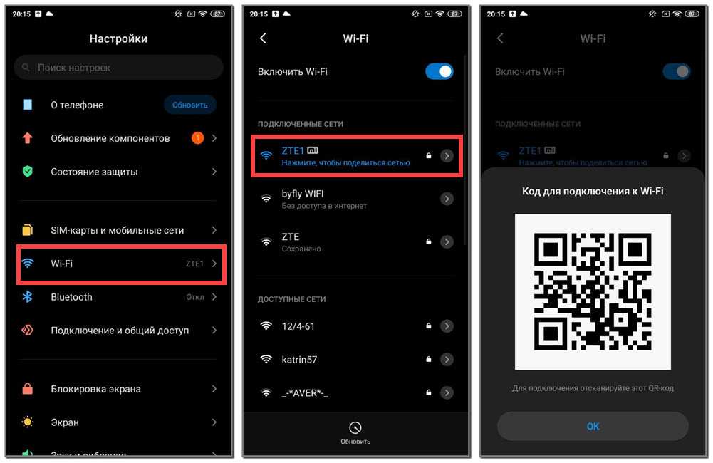 Откройте настройки Wi-Fi и просто нажмите на сеть, к которой подключен смартфон (ниже названия сети написано: «Нажмите, чтобы поделиться сетью»). Откроется окно с QR-кодом.