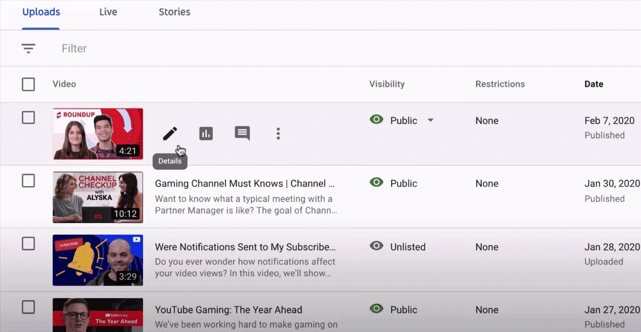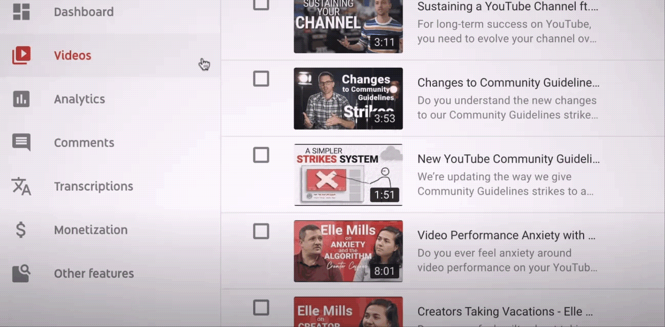 Вы также можете изменить настройки для старых видео. Перейдите на страницу «Видео» в студии YouTube, установите флажки рядом с видео, выберите «Редактировать», а затем «Комментарии».