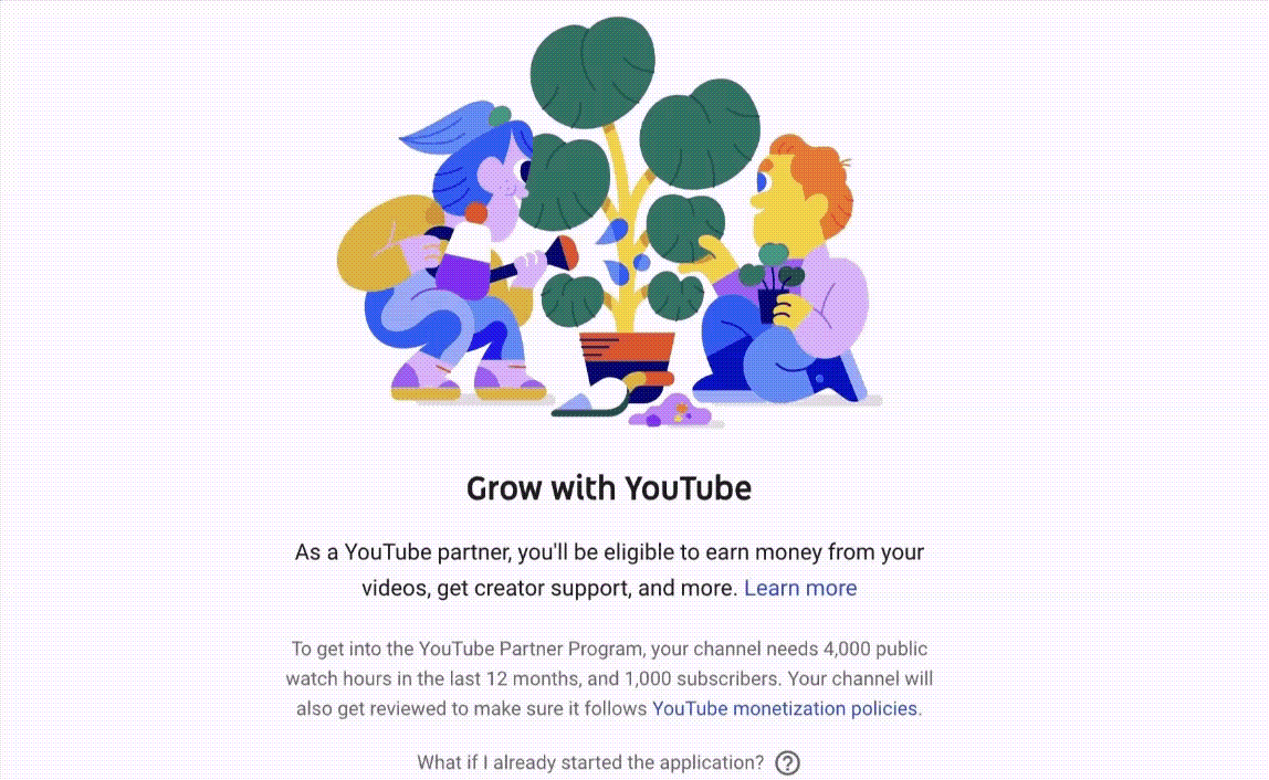 Если вы новичок в подаче заявки, вы увидите страницу, объясняющую ваш статус приемлемости. Однако, если вы соответствуете требованиям, вы увидите прогресс своего канала и требования для партнерской программы YouTube.