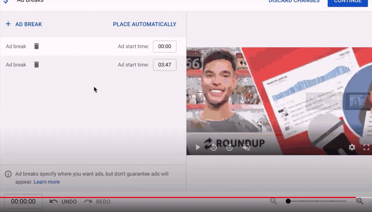 Вы также можете управлять размещением своих объявлений, вводя определенные временные коды в верхней части страницы. Или вы можете использовать временную шкалу для перетаскивания в соответствии с вашими потребностями.