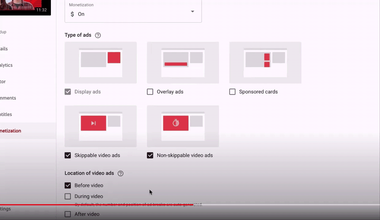 Если это соответствует требованиям, включите монетизацию или обновите настройки рекламы для видео. Выберите видео и перейдите в раздел «Монетизация» в меню слева.