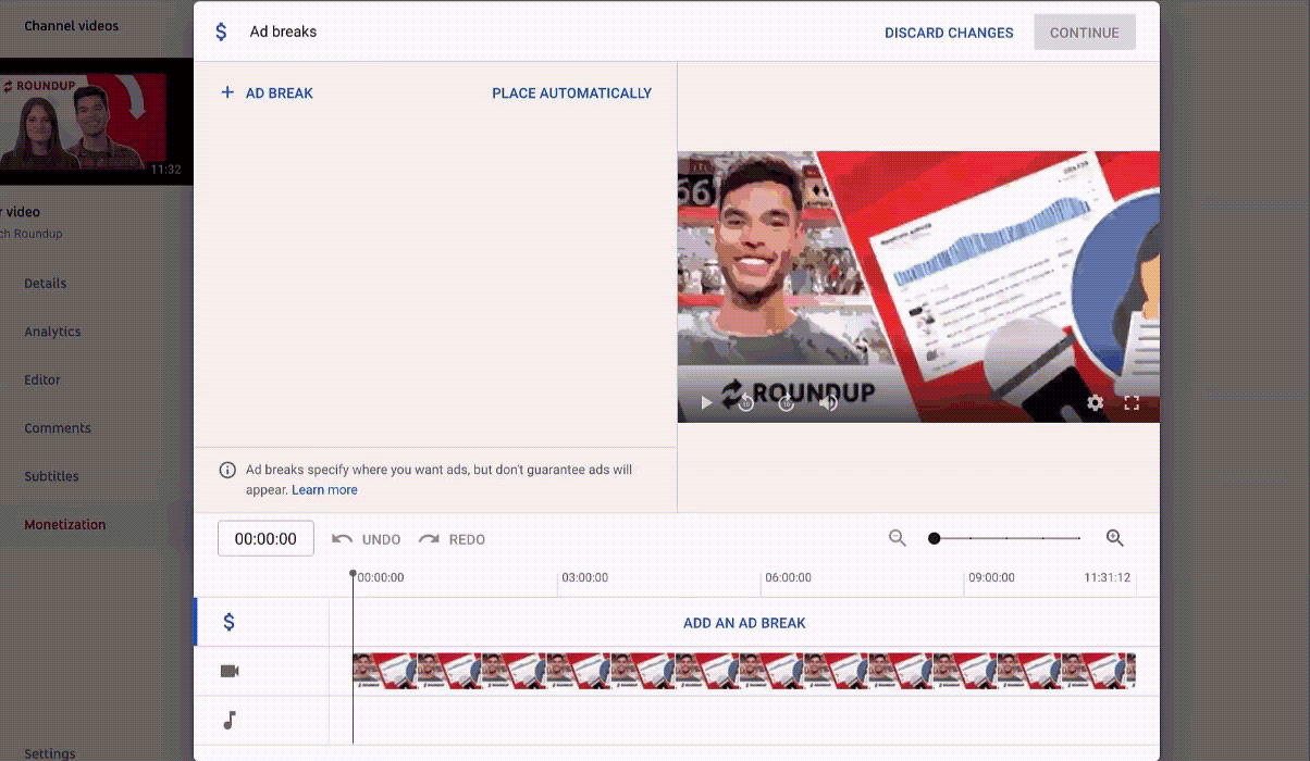 Откроется редактор студии YouTube, который позволяет создавать предварительные просмотры и устанавливать вручную или автоматически сгенерированные рекламные паузы в середине ролика.