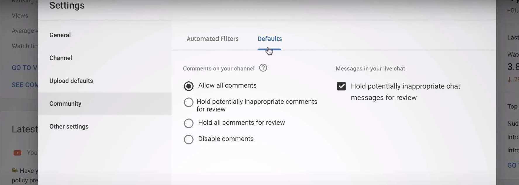 В настройках YouTube перейдите в «Настройки сообщества», затем «По умолчанию». Здесь вы можете выбрать: