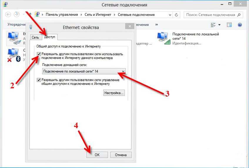 Откроется небольшое окошко свойств. Нажмите вверху на Доступ и установите тут флажок напротив первого пункта (что бы другие пользователи смогли пользоваться этой сетью). Затем потребуется выбрать подключение для сети. Оно должно выглядеть приблизительно как на этом рисунке. Потом нажмите кнопочку «ОК».
