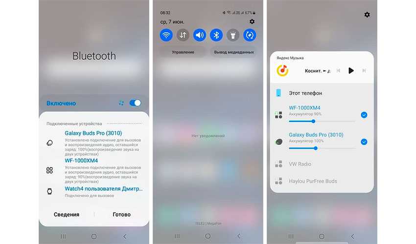 - Откройте на телефоне шторку (проведите пальцем сверху вниз в верхней части экрана телефона, чтобы получить доступ к быстрому меню) и нажмите на «Медиа», «Вывод медиаданных» или аналогичную по назначению кнопку (название отличается в зависимости от модели телефона и версии Андроид). Вы должны увидеть две пары подключенных наушников в качестве аудиовыходов.