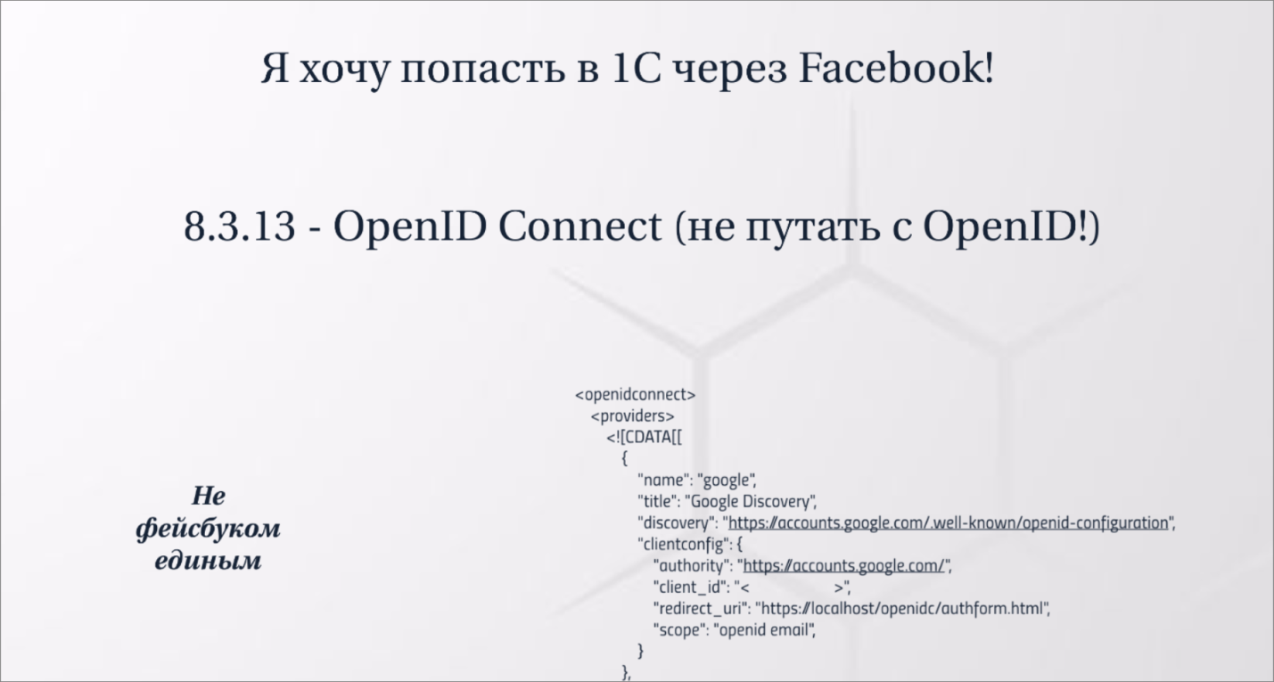 Тут я хотел рассказать про некие специфичные подходы, призванные оптимизировать трудозатраты разработчика. Но к счастью, мне не пришлось этого делать, потому что в платформе 8.3.13 появилась замечательная возможность – OpenID Connect. Не путать с OpenID – ужасное, страшное решение, которое ничего общего с нормальным SSO (Single Sign On) не имеет, зачем они его сделали – не знаю.