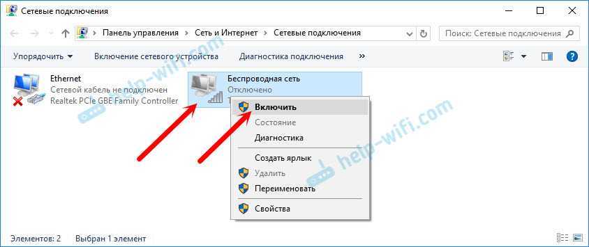 Там должно быть «Беспроводное сетевое соединение». Или «Беспроводная сеть» – в Windows 10. Если это подключение со статусом «Отключено», то нажмите на него правой кнопкой мыши и выберите «Включить».