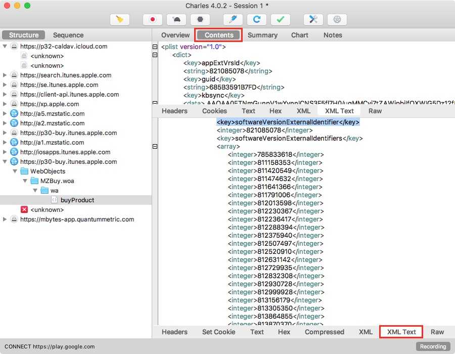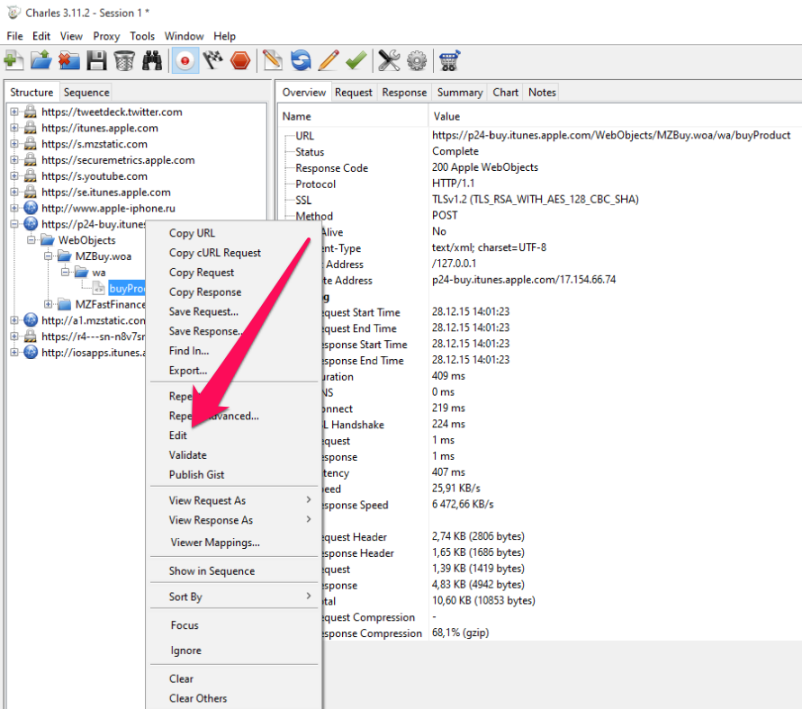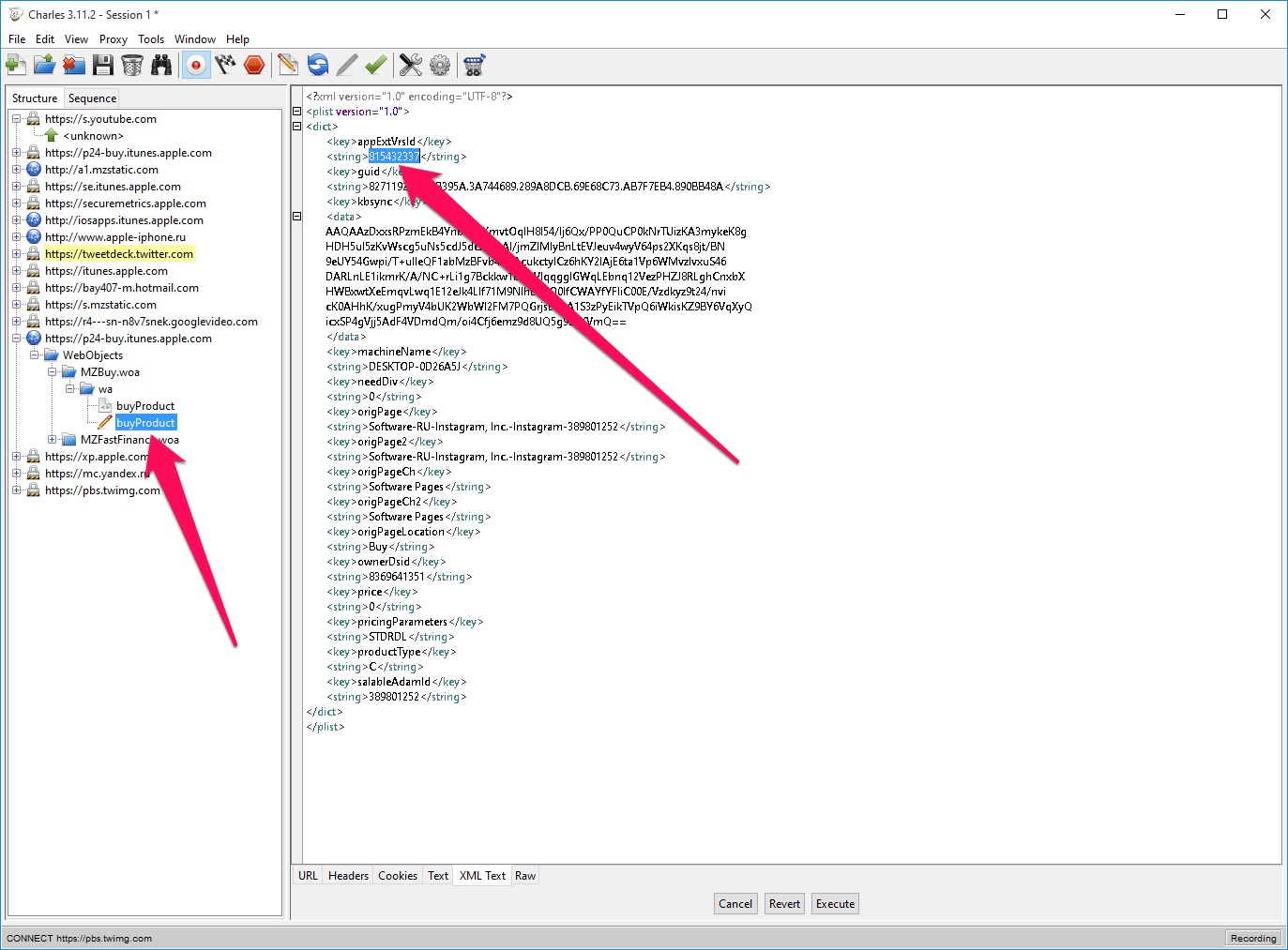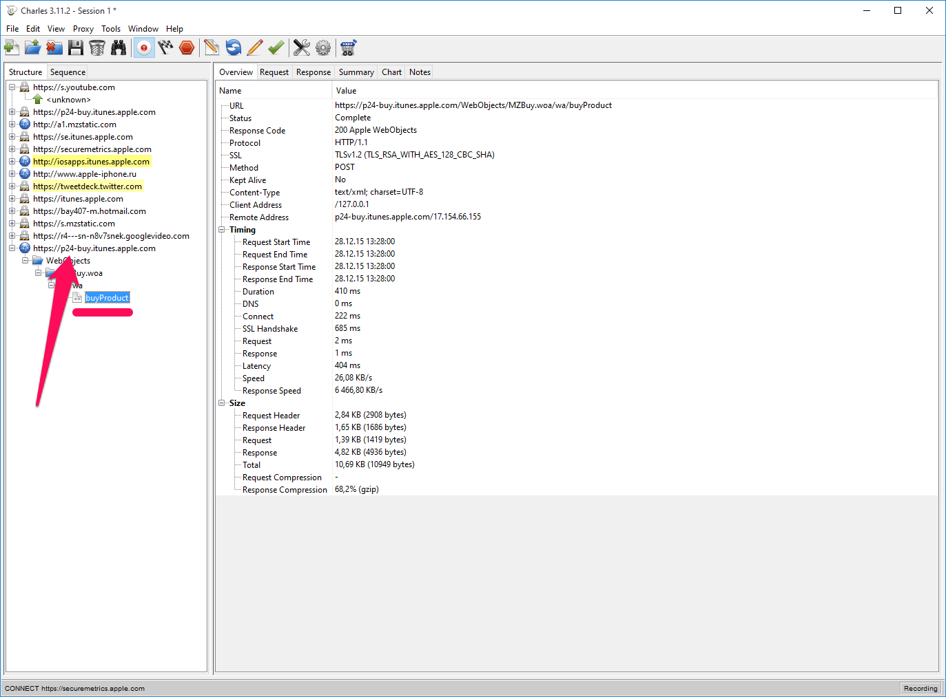 Перейдите к Charles и найдите новую строчку содержащую «buy.itunes.apple.com». Раскройте ее и выберите «buyProduct»