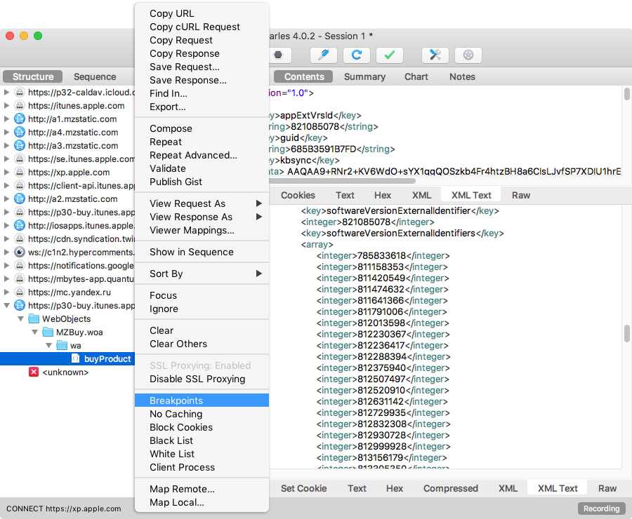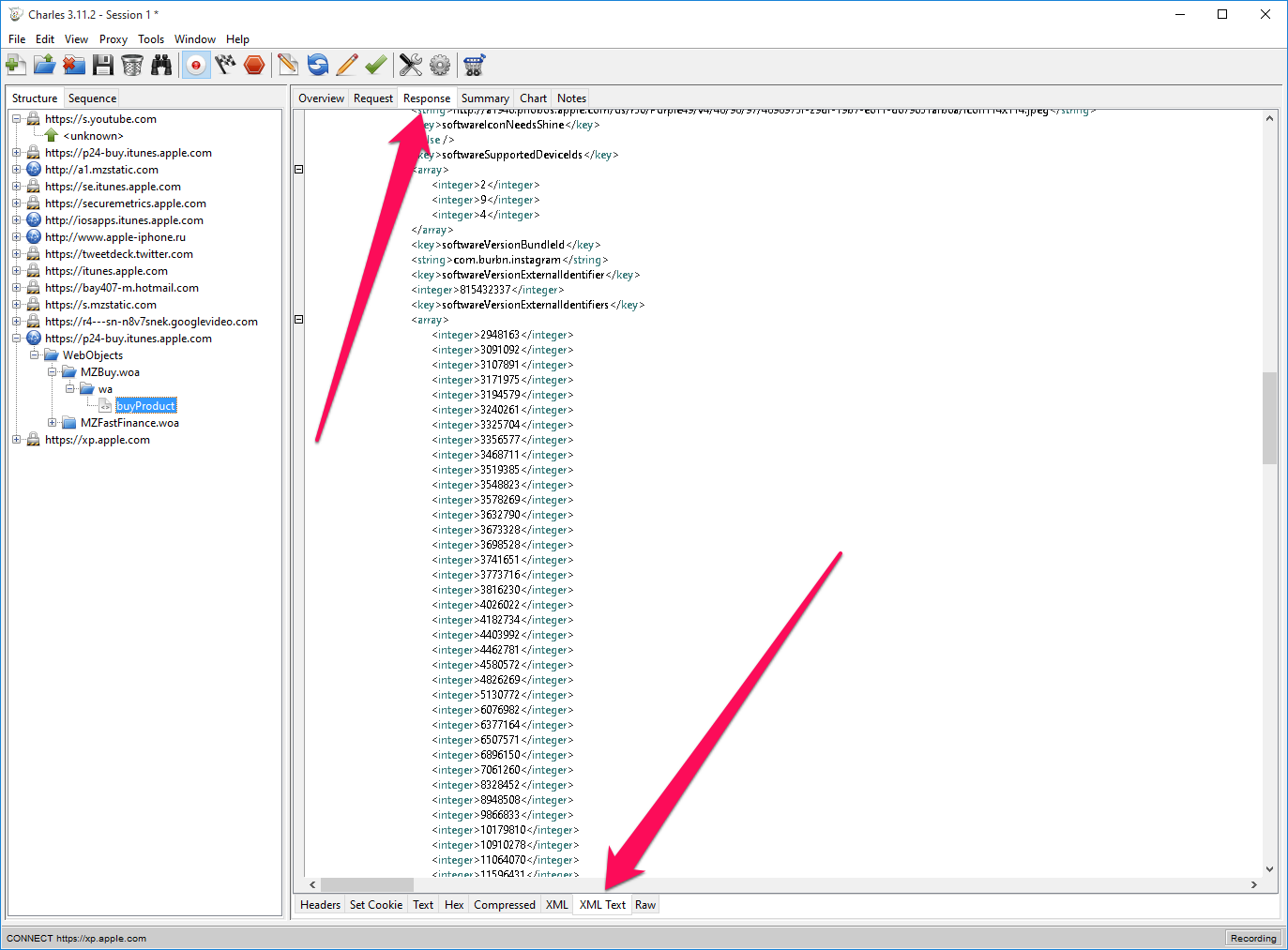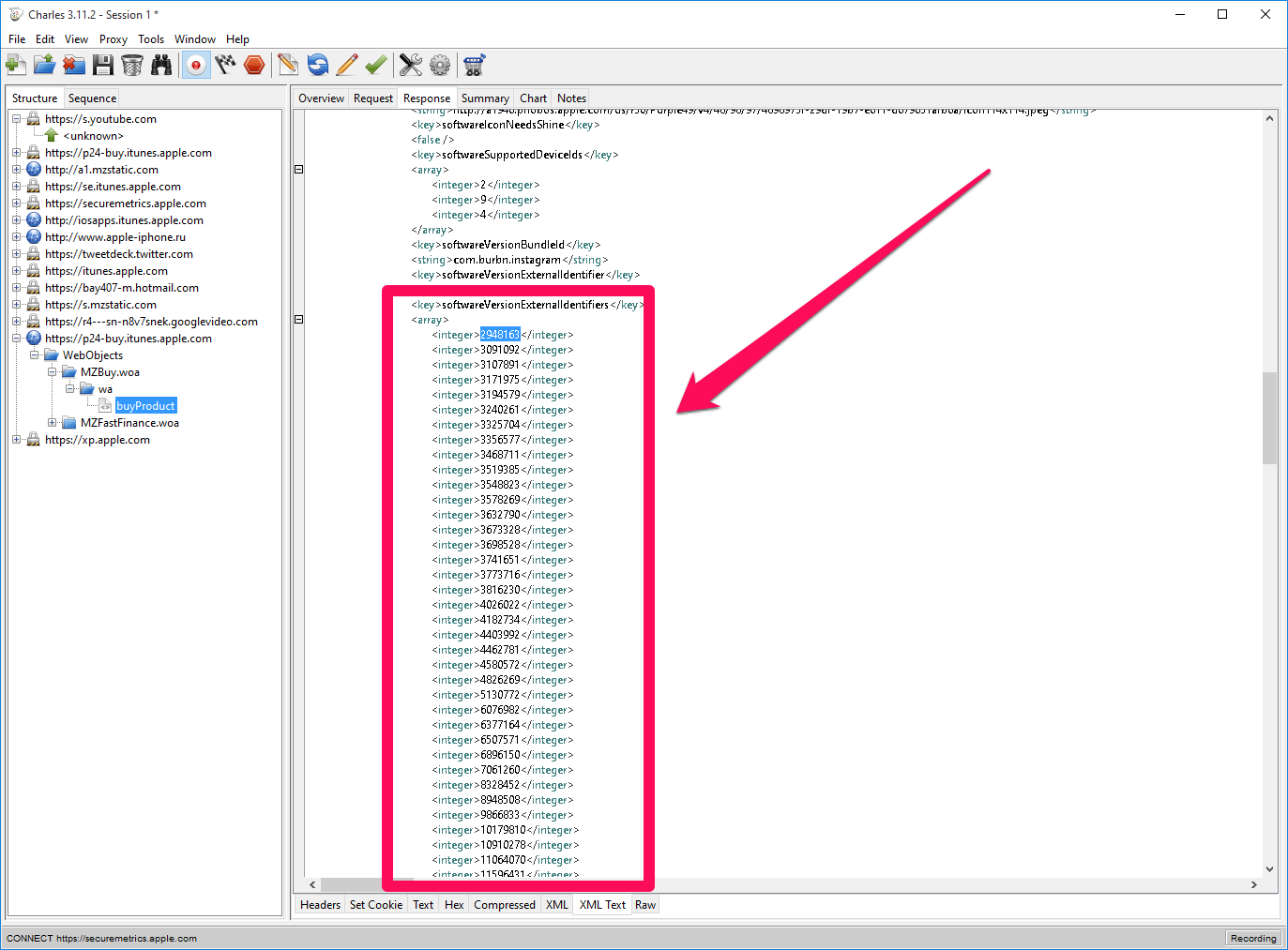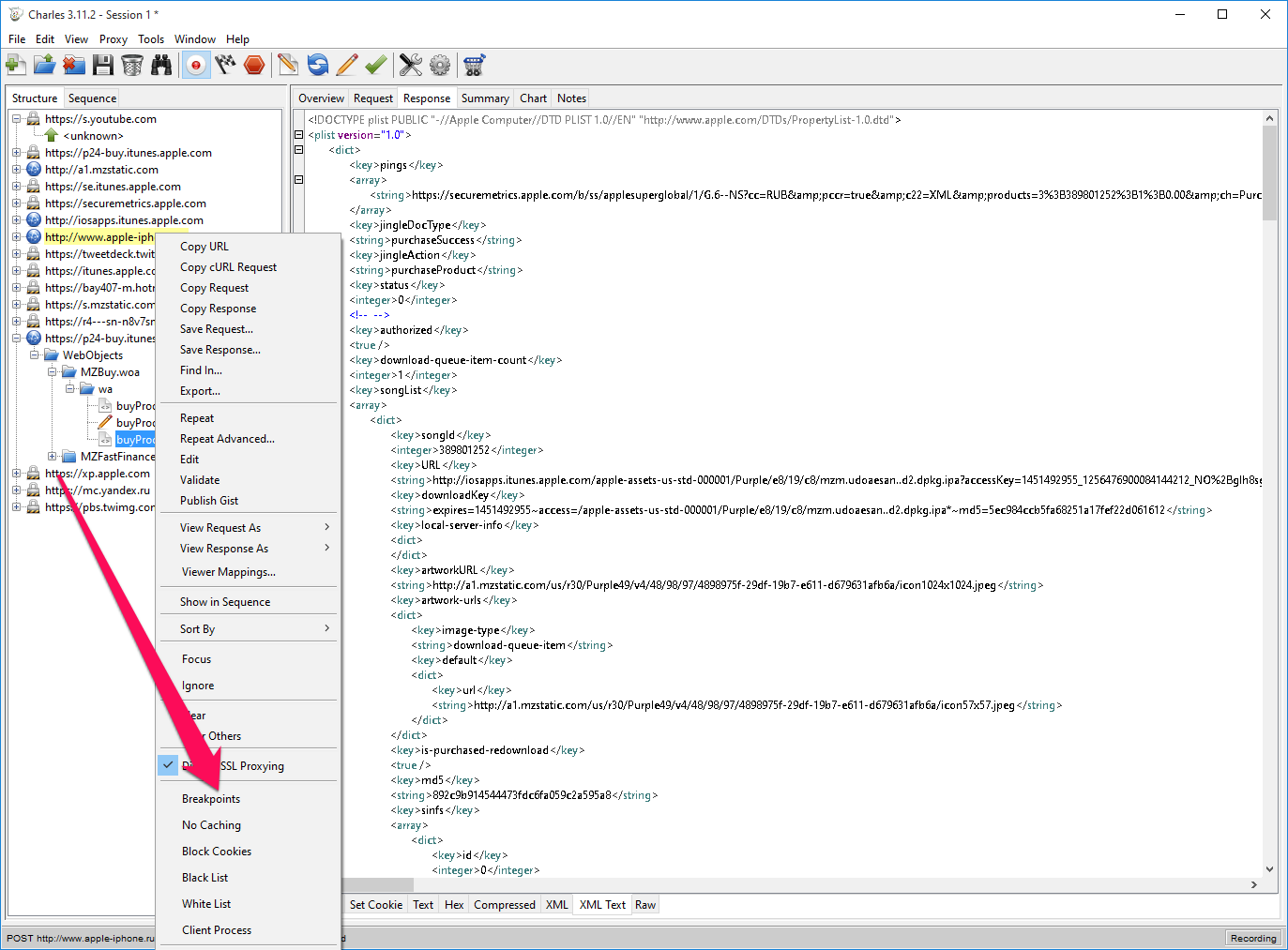 Перейдите к Charles и найдите новую строчку содержащую «buy.itunes.apple.com». Раскройте ее и выберите «buyProduct»