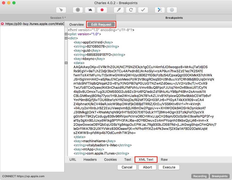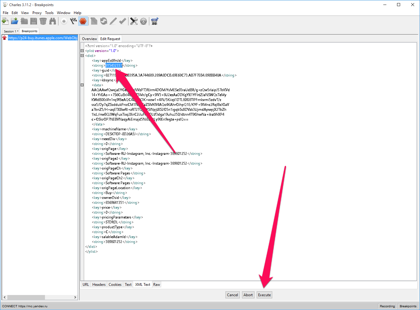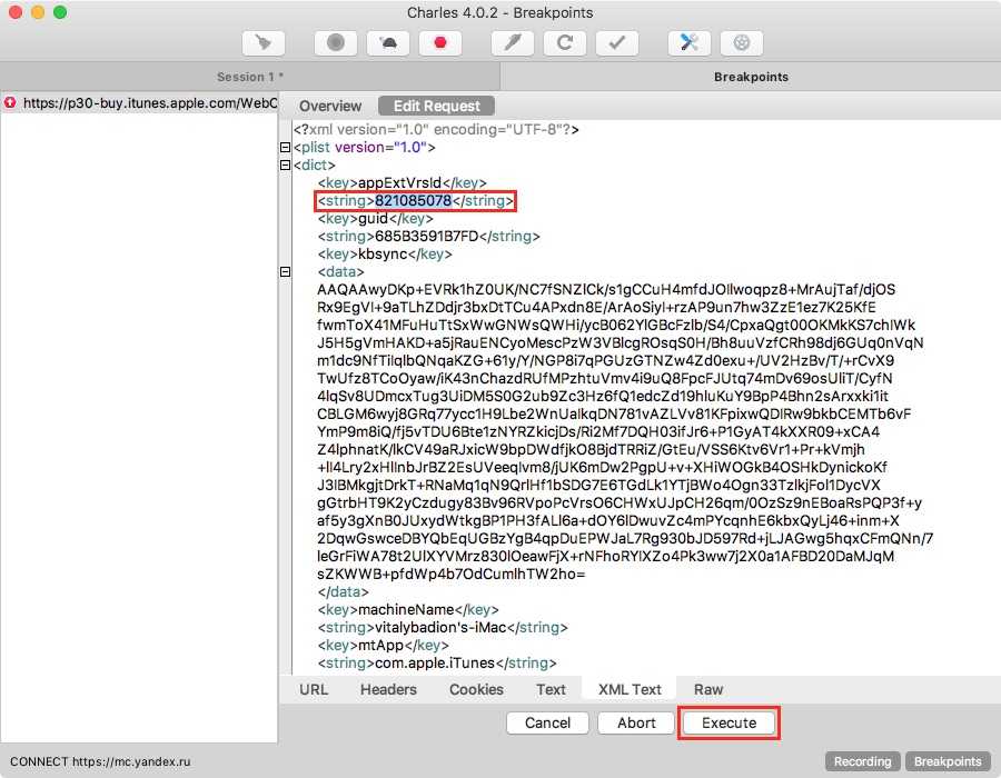 Шаг 15. Через мгновение после нажатия вами кнопки загрузки, вас перенесет в Charles, где нужно переключиться на экран Edit Request —> XML Text. В поле XXXX вместо «XXX» вставьте номер сборки, скопированный вами на 9 шаге, после чего нажмите кнопку Execute.