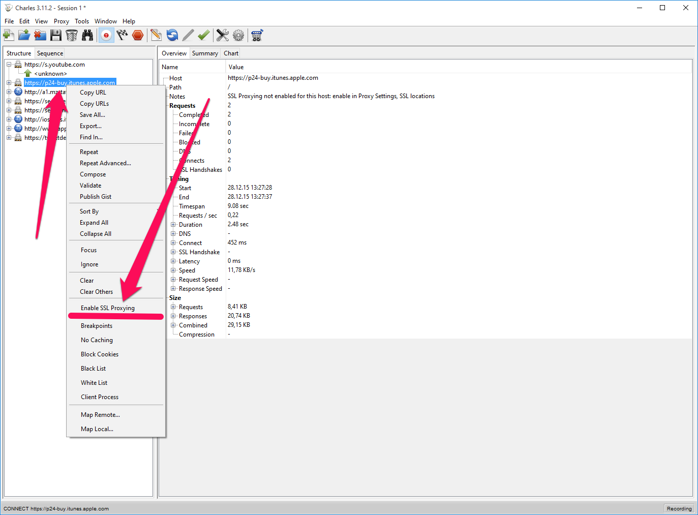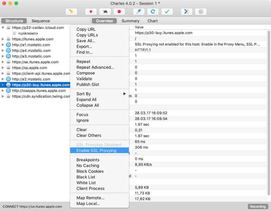 Перейдите к программе Charles и в панели Structure (слева) найдите строчку содержащую «buy.itunes.apple.com». Кликните на ней правой клавишей мыши и выберите пункт Enable SSL Proxying