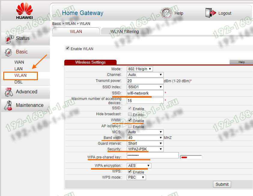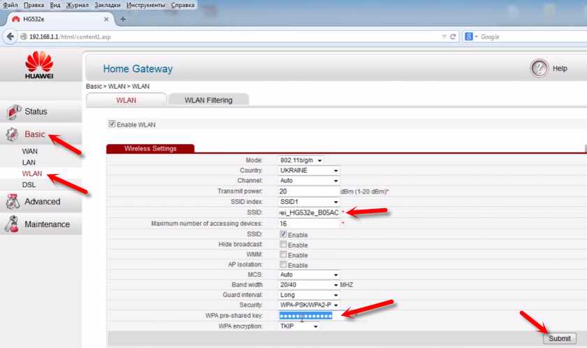 В настройках модема Huawei нужно открыть раздел «Basic» и «WLAN».
