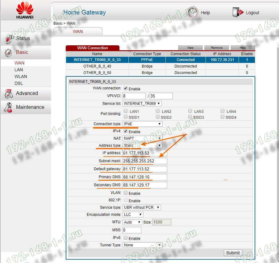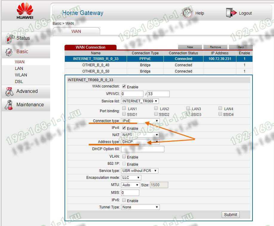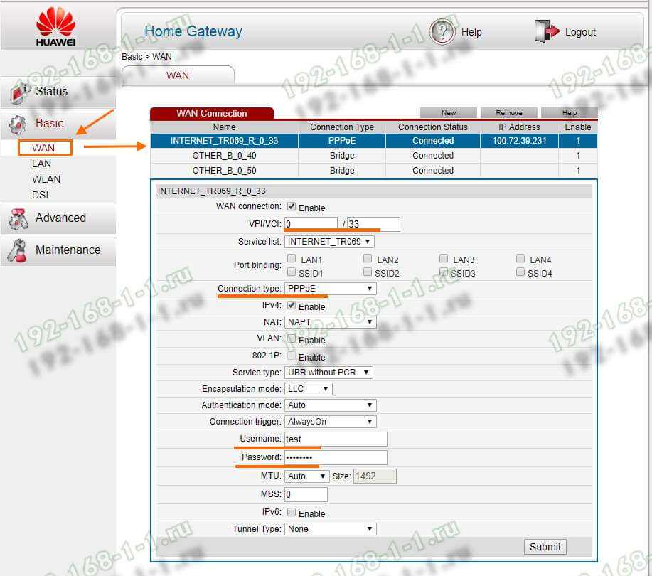 Настройка Huawei HG532E почти идентична другим моделям хуавей. Однако, адрес веб-интерфейса чуть отличается, а именно “192.168.1.1”. После авторизации нужно зайти в WAN через вкладку Basic, там, после выборе сети INERNET_B_ATM_0_33, можно начинать к вписыванию и обозначению нужных конфигураций. Для начала также рассмотрим PPPoE, поэтому выбираем этот тип подключения, после чего вписываем логин и пароль из документов. Всё остальное данного роутера должно быть правильными по умолчанию и соответствовать скриншоту: