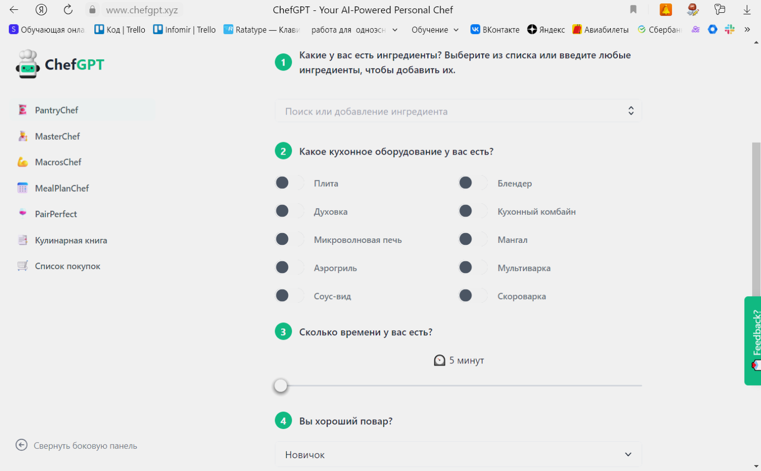 Сервис составляет рецепты блюд и даёт инструкции по их приготовлению. По запросу пользователя нейросеть разработает план питания, предложит рецепты для завтрака, обеда и ужина, расскажет о традиционных блюдах разных стран.